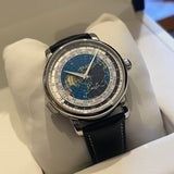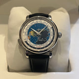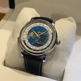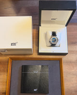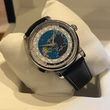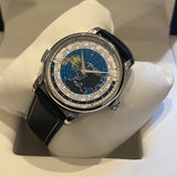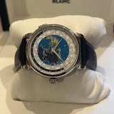 Diameter 43 mm. Stainless steel case. Smooth steel bezel. Montblanc crown. Blue dial with colored world map. Sapphire crystal. Automatic movement. Caliber MB29.20. Transparent case back. Off-brand black leather strap. Stainless steel double folding clasp with Montblanc emblem.