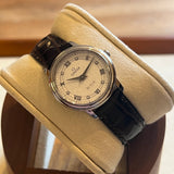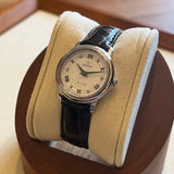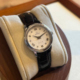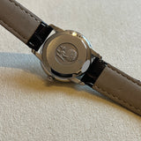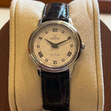 Diameter 27.4 mm. Stainless steel case. Smooth stainless steel bezel. Textured silver dial with Roman numerals. Indexes set with 6 diamonds. Sapphire crystal. Quartz movement. Solid stainless steel case back with Omega emblem. Replacement black leather strap non-original. Stainless steel pin buckle with Omega emblem.