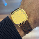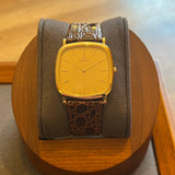 Diameter: 30 mm * 35 mm. Gold-plated steel case. Smooth gold-plated steel bezel. Omega crown. Champagne dial without numerals. Quartz movement. Brown off-brand leather strap. Gold-plated steel pin buckle with Omega emblem.