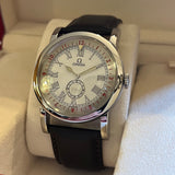 Diameter 40 mm. Stainless steel case. Steel bezel. Mother-of-pearl dial with Roman numerals. Luminous hands. Sapphire crystal. Automatic movement. Solid stainless steel case back with Omega emblem. Replacement black leather strap, non-original Omega. Steel pin buckle with Omega emblem.