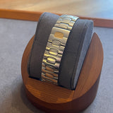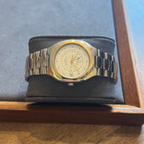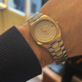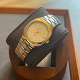 Diameter 31 mm. Wrist circumference of 19 cm. Case in stainless steel and 18Kt yellow gold. Smooth bezel in 18Kt yellow gold. Omega crown. White dial without numerals. Luminous hands and indices. Sapphire crystal. Quartz movement. Solid stainless steel case back with Seamaster emblem. Original Omega stainless steel bracelet. Stainless steel folding clasp with Omega emblem.