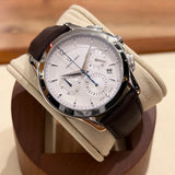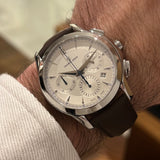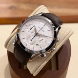Diameter 41.5 mm. Stainless steel case. Smooth steel bezel. Silvered dial with Arabic numerals at 12 o’clock. Blued hands. Sapphire crystal. Automatic chronograph movement. UG 71.6 caliber. 42-hour power reserve. Transparent sticker case back. Original Universal Genève brown leather strap. Steel deployant clasp with Universal Genève emblem.