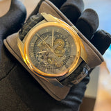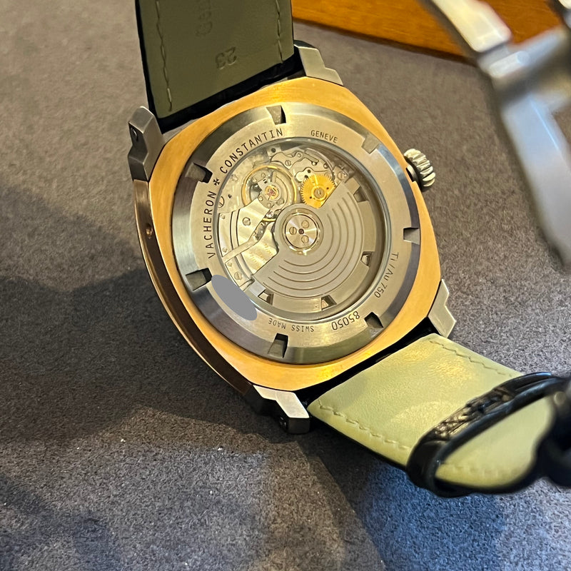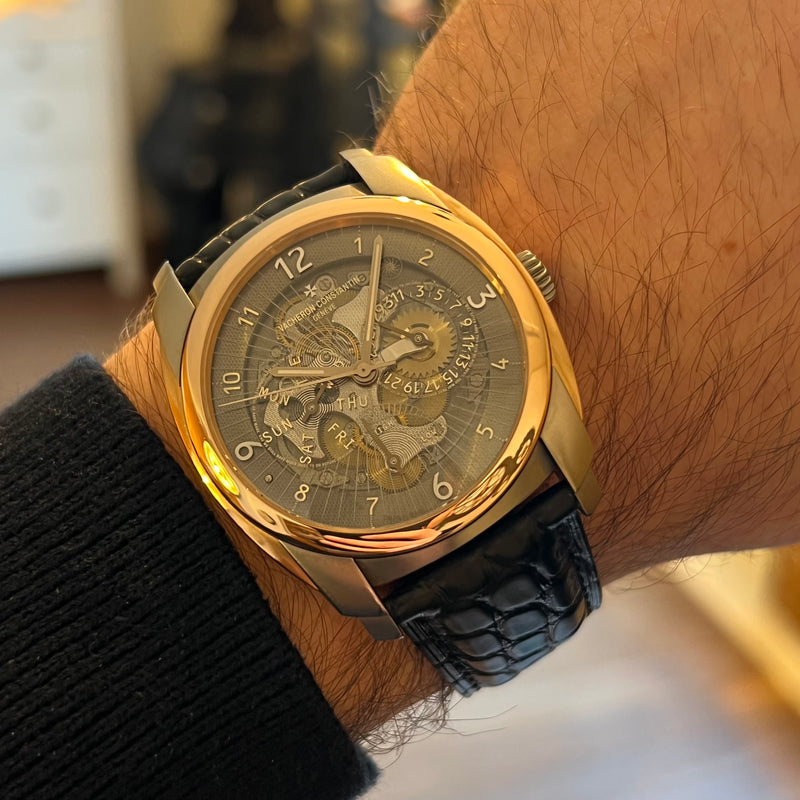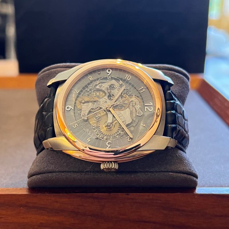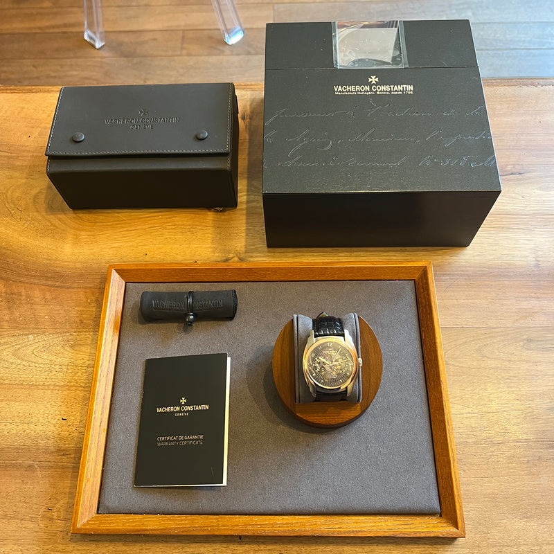 Diameter 42 mm. Case in titanium and yellow gold. Smooth bezel in yellow gold. Skeleton dial with Arabic numerals. Luminescent hands. Sapphire crystal. Automatic movement. Transparent case back. Replacement black leather strap, not original Vacheron Constantin. Double folding clasp in titanium with Vacheron Constantin emblem.
