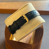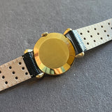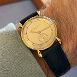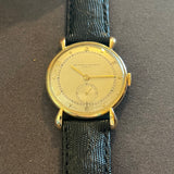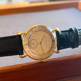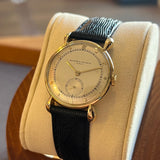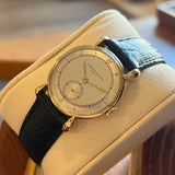 Diameter 31 mm. 18 kt yellow gold case. Smooth bezel. Champagne dial with Arabic numerals. Plexiglass crystal. Manual winding movement. Solid yellow gold case back. Replacement black leather strap, not original. Replacement gold-tone pin buckle, not original.