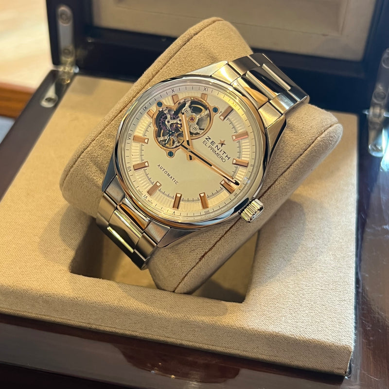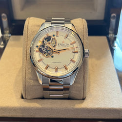 Diameter 40 mm. Case and bracelet in stainless steel. Smooth steel bezel. Zenith crown. Silver open heart dial. Gold-toned hands and indexes. Sapphire crystal with slight chip at 4 o'clock. Automatic movement. El Primero 4613 caliber. Power reserve of 50 hours. Transparent case back. Double folding steel clasp with Zenith emblem.