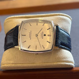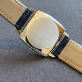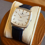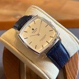 Diameter 33 mm. White gold case. Silver dial without numerals. Plexiglass crystal. Automatic micro-rotor movement. Solid white gold case back. Replacement non-original blue leather strap. Original Universal Genève pin buckle and replacement pin buckle.
