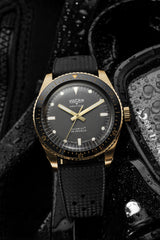 Its resolutely vintage presence makes this diver's watch more than a compelling proposition in the landscape of reissued diving watches of yesteryear. The Skindiver Nautique has all the attributes of an underwater tool watch, as evidenced by the ultra-legible Super-Luminova-enhanced hands and indexes, which come in khaki brown for an elegant contrast by day and enhanced legibility in low-light conditions, and the unidirectional fluted bezel with black ceramic insert and contrasting white markers. Rated to a depth of 200 meters, the watch is ideally proportioned with a 38mm stainless-steel case.