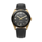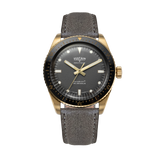 The Skindiver Nautique 38mm comes with a matte grey dial with white transfer-printed minute track and signature, khaki brown Super-Luminova-enhanced hands and hour markers; the ‘quick-change’ strap is leather with a black carbon pattern and matching stitching.