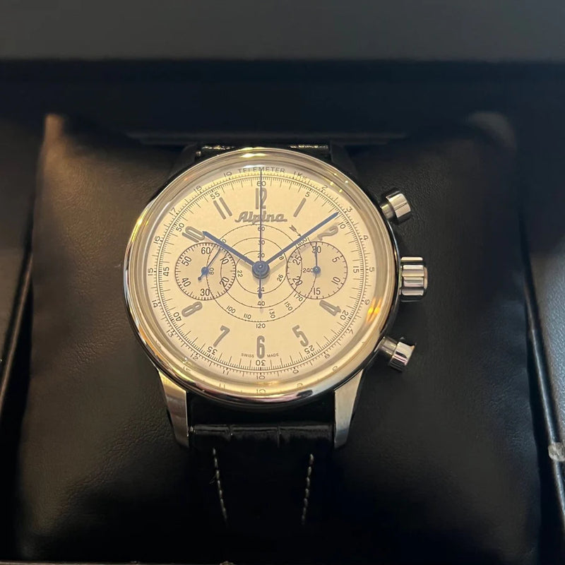 Diameter 41 mm. Stainless steel case. Silver dial with Arabic numerals. Blued hands. Sapphire crystal. Automatic chronograph movement. Caliber AL-860. 42-hour power reserve. Transparent case back. Non-original black leather replacement strap. Original Ardillon buckle with Alpina emblem.
