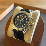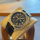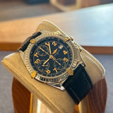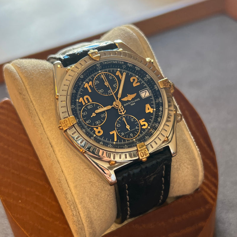 Diameter 39 mm. Stainless steel case. Gold-plated stainless steel bezel. Blue dial with Arabic numerals. Gold-plated hands and index. Luminous hands. Sapphire crystal. Automatic chronograph movement. Solid case back with Breitling emblem. Replacement black leather strap, not original. Stainless steel deployant clasp with Breitling emblem.