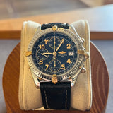 Diameter 39 mm. Stainless steel case. Gold-plated stainless steel bezel. Blue dial with Arabic numerals. Gold-plated hands and index. Luminous hands. Sapphire crystal. Automatic chronograph movement. Solid case back with Breitling emblem. Replacement black leather strap, not original. Stainless steel deployant clasp with Breitling emblem.