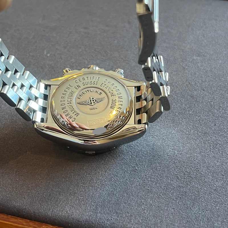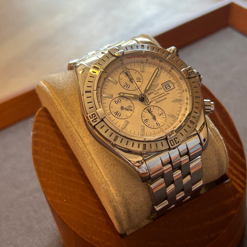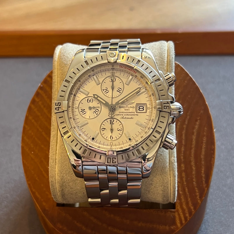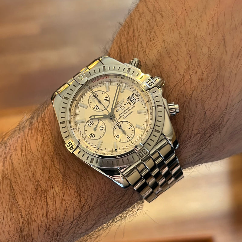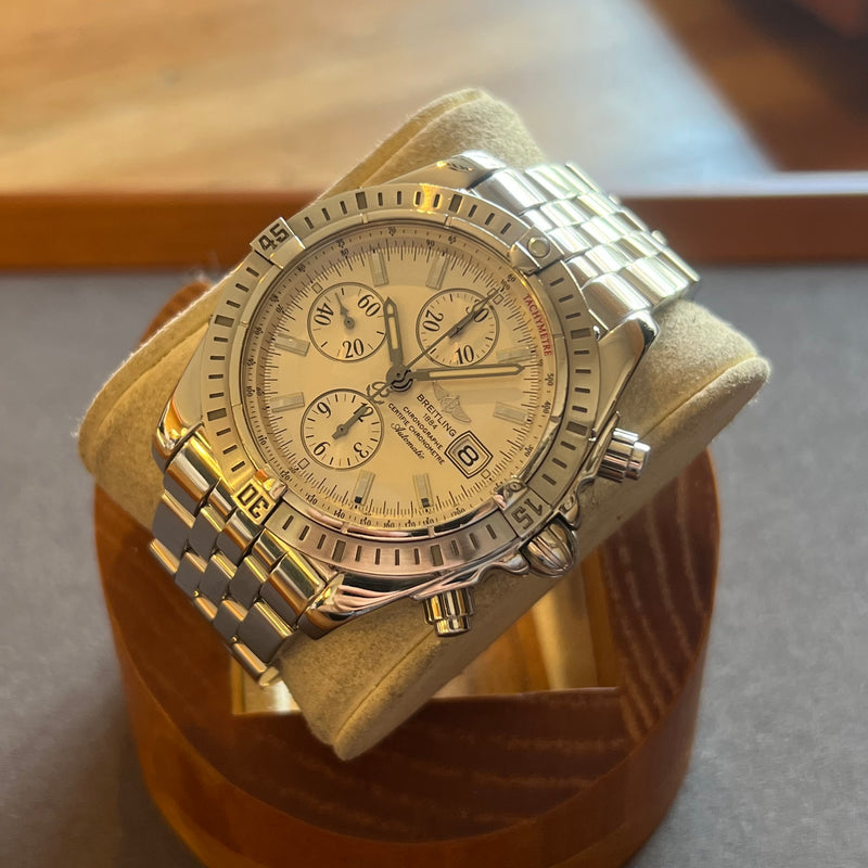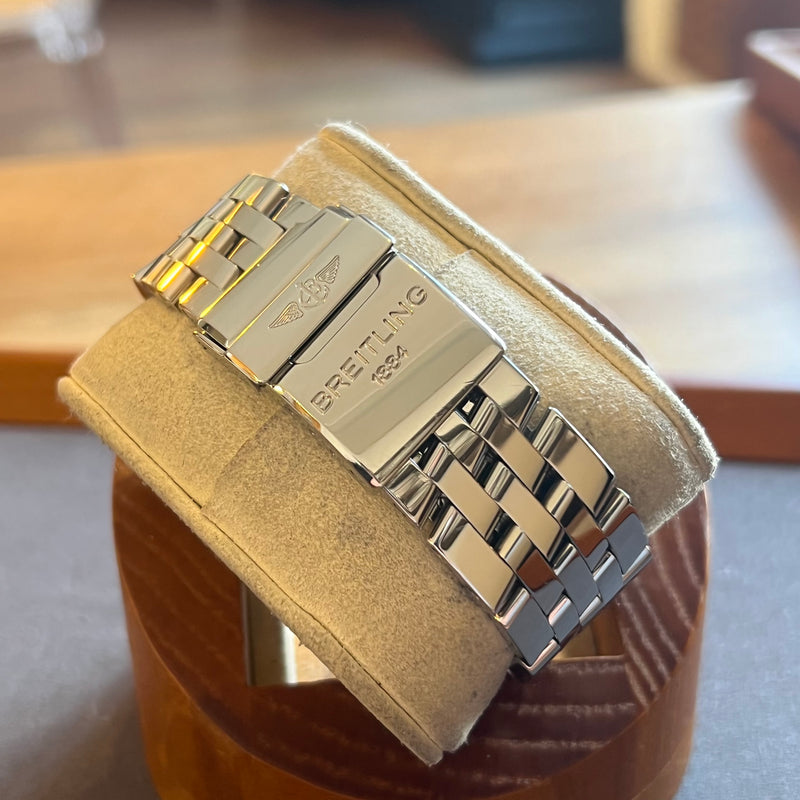 Diameter 43 mm. Thickness 17 mm. Wrist circumference 18 cm. Case and bracelet in stainless steel. Steel bezel. Silver dial without numerals. Tachymeter printed on the dial. Luminous hands. Sapphire crystal. Automatic chronograph movement. Solid case back with Breitling emblem. Deployant clasp in steel with Breitling emblem.