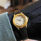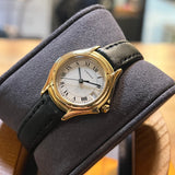 Diameter 26mm. 18Kt yellow gold case. Smooth 18Kt yellow gold bezel. Cartier crown with blue cabochon. Ivory dial with Roman numerals. Blued hands. Sapphire crystal. Quartz movement. Solid 18Kt yellow gold caseback. Black replacement off-brand leather strap. Cartier tang buckle.