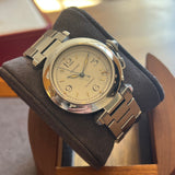 Diameter 35 mm. Wrist size 14 cm without the 4 extra links. Stainless steel case and bracelet. Smooth stainless steel bezel. Cartier crown. White dial with Arabic numerals. Blued hands. Sapphire crystal. Automatic movement. Solid stainless steel case back with Cartier emblem. Stainless steel double folding clasp with Cartier emblem.
