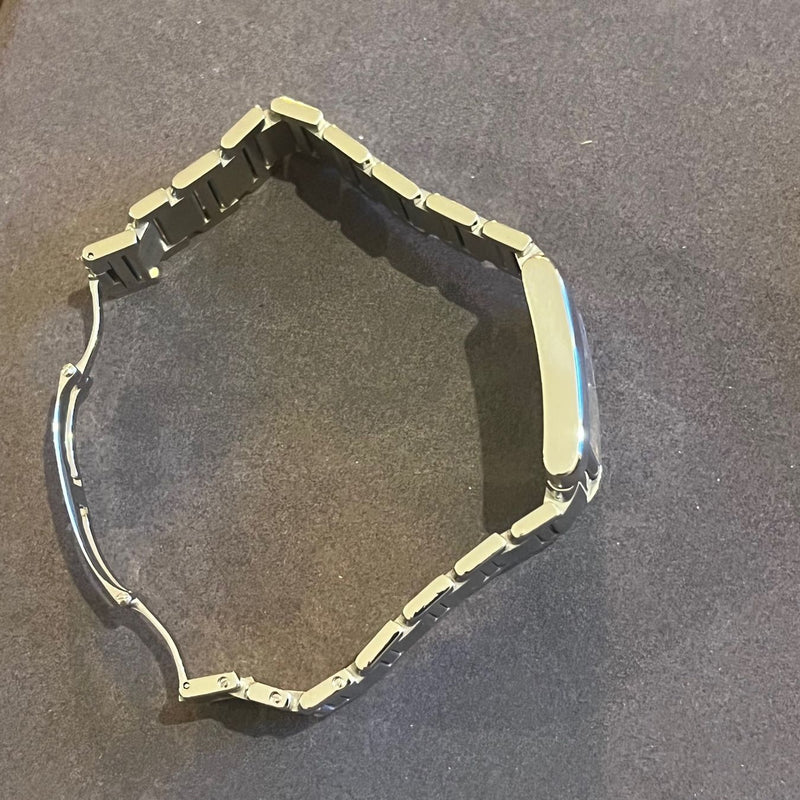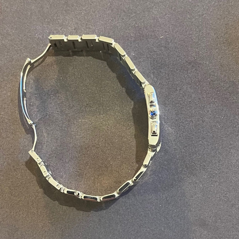 Diameter 28mm*36mm. Quartz movement. Stainless steel housing. White dial with Roman numerals. Sapphire crystal. Waterproof to 30 meters. Original Cartier steel bracelet and double folding clasp. Blue cabochon crown. Full case back with Cartier international service stickers.