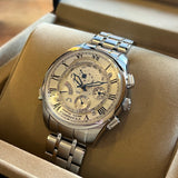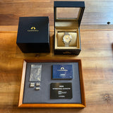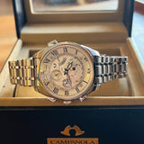 Diameter 42mm. Case and bracelet in stainless steel. Silver dial with Roman numerals. Quartz movement. Solid case back with Campanola emblem. Stainless steel deployant clasp with Campanola emblem.