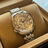 Functions: Hours, minutes, perpetual calendar, display of date, day, and years, sub-dial with second time zone.