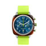 Clubmaster Classic chronograph Summer Vibes Edition watch, 40 mm. Polished steel case and tortoiseshell acetate. Peacock blue sunray dial. Chronograph, date, 2 counters. 60-minute counter at 9 o'clock, 24-hour counter at 3 o'clock. Hands with white Superluminova® luminescent inserts. Neon yellow lacquered chronograph and counter hands. Domed mineral crystal. Crown and push-buttons with neon yellow inserts. Exclusive Briston 245 mm NATO strap: neon yellow with polished steel buckles. Miyota OS21 quartz calibre.