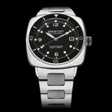 HMS automatic Clubmaster Legend Diver watch, 40 mm. Fully mirror-polished 316L stainless steel case. Black dial. Hours, Minutes, Centre seconds and Date. Unidirectional rotating sapphire bezel with Superluminova® C3 indications and bars. Hands with Superluminova® C3 luminescent inserts. Ultra-resistant sapphire crystal. Water-resistant to 200m / 20 ATM. Exclusive 316L steel bracelet with double presto system. Miyota 8315 automatic movement.