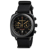 Clubmaster Sport chronograph watch, 42 mm. Steel case with matt black PVD finish and matt black acetate. Matt black dial. Chronograph, date, 2 counters. 60-minute counter at 9 o'clock, 24-hour counter at 3 o'clock. Hands with sand-beige inserts. Domed mineral crystal. Exclusive Briston interchangeable strap: black with matt black PVD steel buckles. Miyota OS21 quartz calibre.