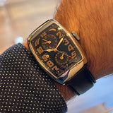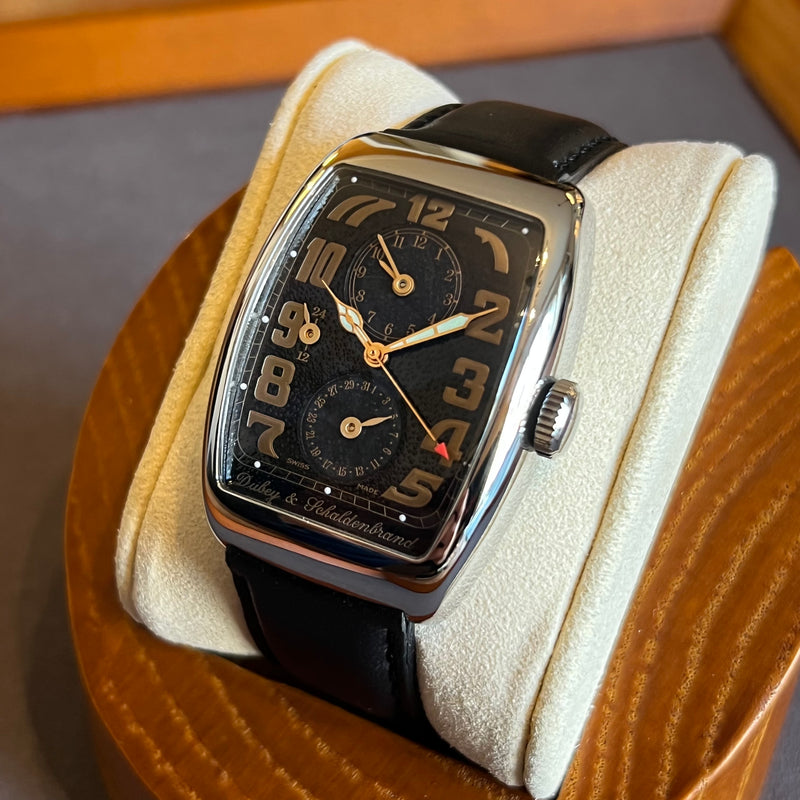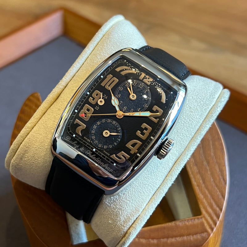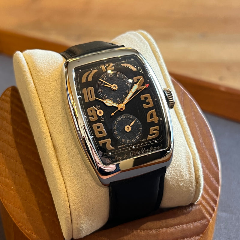 Diameter 44 x 33 mm. Thickness 11.5 mm. Stainless steel case. Smooth steel bezel. Black dial with Arabic numerals. Luminous hands and tips. Sapphire crystal. Automatic GMT movement. Caliber ETA 2892-A2. Solid stainless-steel case back with Dubey & Schaldenbrand emblem. Replacement off-brand black leather strap. Steel pin buckle with Dubey & Schaldenbrand emblem.