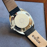 Diameter 44 mm. Stainless steel case. Graded steel bezel. Cream dial without numerals. Sapphire crystal. Automatic movement. Solid stainless steel case back with Edox emblem. Black Edox leather strap. Edox pin buckle.