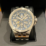 Diameter 43 mm. Wrist size 17.4 cm. Case and bracelet made of stainless steel. Fixed stainless steel bezel. Blue skeleton dial without numerals. Luminous hands. Sapphire crystal. Automatic movement. Transparent case back. Stainless steel double folding clasp with Edox emblem.