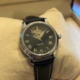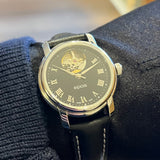 Diameter 32 mm. Stainless steel case. Smooth steel bezel. Black dial with Roman numerals. Sapphire crystal. Automatic movement. Transparent case back. Replacement off-brand black leather strap. Epos pin buckle.