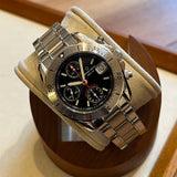 Diameter 39 mm. Wrist circumference of 20.3 cm. Stainless steel case and bracelet. Graduated steel bezel. Black dial without numerals. Luminous hands and indexes. Sapphire crystal. Automatic movement. Valjoux 7750 caliber. Solid stainless steel case back with Eterna emblem. Double folding stainless steel clasp.