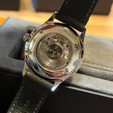 Diameter 41 mm. Stainless steel case. Smooth steel bezel. Black dial with Arabic numerals. Luminous hands. Sapphire crystal. Automatic movement. Transparent case back. Original Fortis black nylon strap. Steel pin buckle with Fortis emblem.