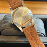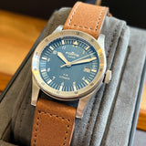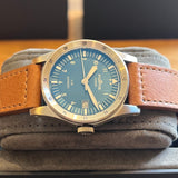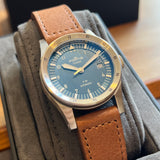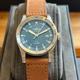 Diameter 39 mm. Stainless steel case. Graduated steel bezel. Blue dial with Arabic numerals. Luminous hands and indexes. Sapphire crystal. Automatic movement. Solid stainless steel case back with sticker and Fortis emblem. Brown Fortis leather strap. Fortis pin buckle.