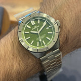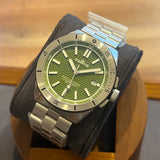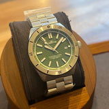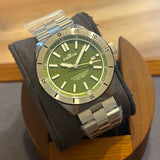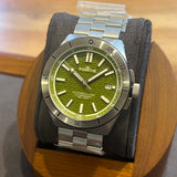 Diameter 40 mm. Wrist size 22.5 cm. Case and bracelet in stainless steel. Graduated steel bezel. Green dial without numerals. Luminous hands and indexes. Sapphire crystal. Automatic movement. Solid steel case back with Fortis emblem. Steel deployant clasp with Fortis emblem.
