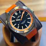 Diameter 44 mm. Case in stainless steel. Graduated bezel in steel. Black dial without numerals. Luminous hands and indexes. Sapphire crystal. Automatic movement. Solid stainless steel caseback with Fortis emblem. Orange rubber strap. Stainless steel folding clasp with Fortis emblem.