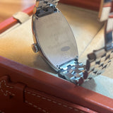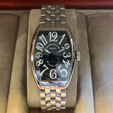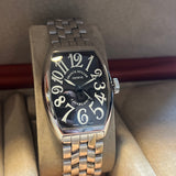 Diameter 32mm*45mm. Case and bracelet in stainless steel. Smooth stainless steel bezel. Black dial with Arabic numerals. Blued hands. Sapphire crystal. Automatic movement. Solid stainless steel case back. Stainless steel double folding clasp with Franck Muller emblem.