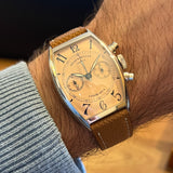 Diameter 32 mm* 44 mm. Case in 18Kt white gold. Smooth bezel in 18Kt white gold. Salmon dial with Arabic numerals. Luminous hands. Sapphire crystal. Automatic movement. Case back in 18Kt white gold with Franck Muller emblem. Brown leather off-brand strap. Franck Muller pin buckle.