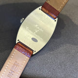 Diameter 34 mm * 47 mm. Stainless steel case. Smooth steel bezel. Franck Muller crown. White dial with Arabic numerals. Blued hands. Sapphire crystal. Automatic movement. Solid steel case back with Franck Muller emblem. Brown Hirsch leather strap. Franck Muller pin buckle.