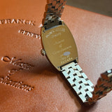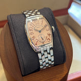 Diameter 29 mm * 39 mm. Wrist size 18.9 cm. Case and bracelet in stainless steel. Smooth steel bezel. Franck Muller crown. Salmon dial with Arabic numerals. Blued hands. Sapphire crystal. Mechanical movement. Solid steel case back with Franck Muller emblem. Double folding clasp in steel with Franck Muller emblem.