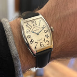 Diameter 29 mm * 39 mm. Stainless steel case. Smooth stainless steel bezel. Silver guilloché dial with Arabic numerals. Blued hands. Sapphire crystal. Quartz movement. Solid stainless steel case back with Franck Muller emblem. Replacement black leather strap off-brand. Replacement stainless steel tang buckle off-brand.