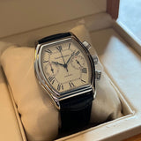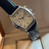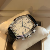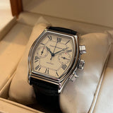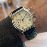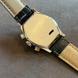 Diameter 36 x 46 mm. Between lugs 20 mm. Stainless steel barrel case. Dial white with Roman numerals and railway. Blued steel hands. Sapphire crystal. Automatic chronograph movement. Solid case back with Girard Perregaux emblem. Non-original replacement black leather strap. Pin buckle with Girard Perregaux emblem a second buckle will be provided. Steel crown.