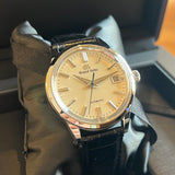 Diameter: 39.5 mm. Thickness: 13.1 mm. Stainless steel case. Smooth steel bezel. Ivory dial without numerals. Sapphire crystal. Automatic movement. Caliber 9S65. 3-day power reserve. Transparent case back. Non-original black leather replacement strap. Stainless steel deployant clasp with Grand Seiko emblem.