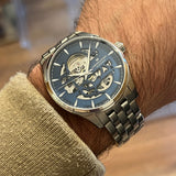 Diameter 40 mm. Thickness 11.05 mm. Wrist size 16.4 cm. Case and bracelet in stainless steel. Blue skeleton dial. Sapphire crystal. Automatic movement. Caliber H-10-S. 80-hour power reserve. Transparent case back. Steel double folding clasp with Hamilton emblem.