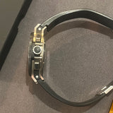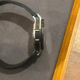 Diameter 44mm. Waterproof 100 meters. Stainless steel housing. Black skeleton dial. Original black rubber strap with small scratch. Original steel folding clasp. Ceramic bezel. Luminous hands and indexes.