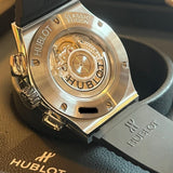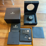 Contents: watch, box, outer box, manual, warranty card, warranty card holder, Hublot tag, leather protection.