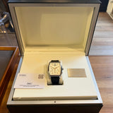 Diameter 43mm*51mm. Stainless steel case. Smooth steel bezel. Silver dial without numerals. Gold hands and indexes. Sapphire crystal. Automatic movement. Caliber 79261. Solid stainless steel caseback with IWC emblem. Black IWC leather strap. Stainless steel folding clasp with IWC emblem.