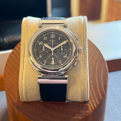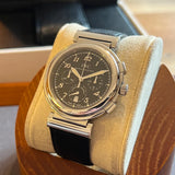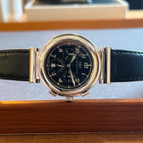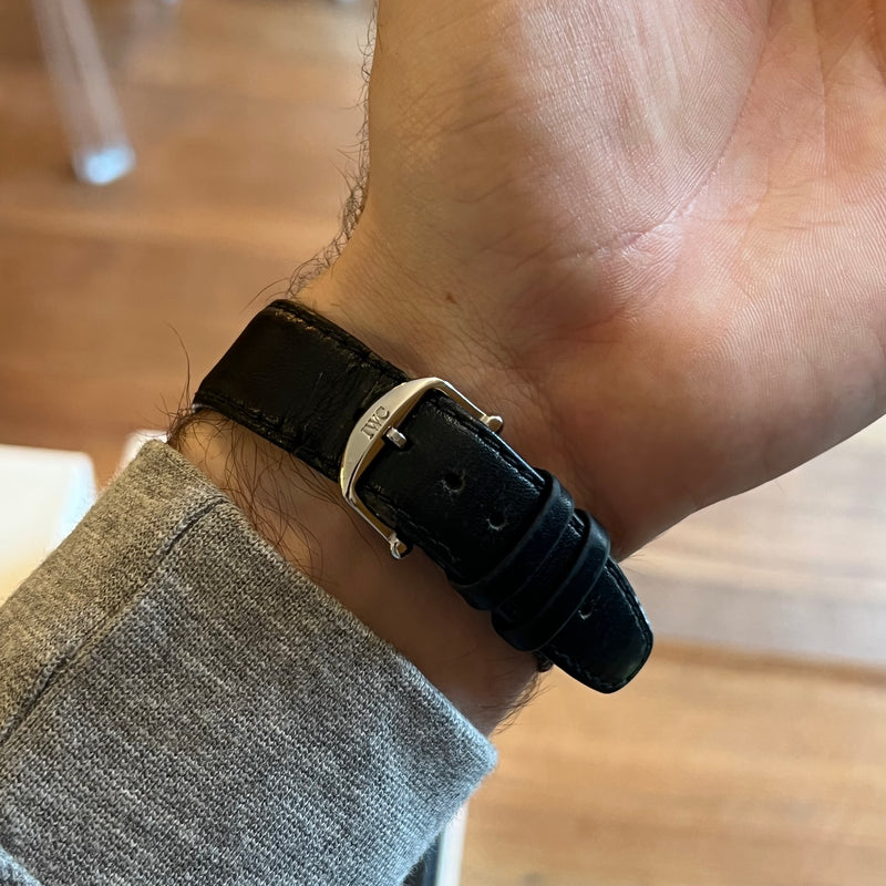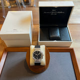 Diameter 37mm. Stainless steel case. Smooth steel bezel. Black dial with Arabic numerals. Luminous hands and markers. Sapphire crystal. Quartz movement. Solid case back. Original black leather IWC strap. Steel pin buckle with IWC emblem.