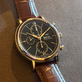 Functions: Hours, minutes, small seconds with stop device, chronograph, date and day display, hour, minute and second stop.