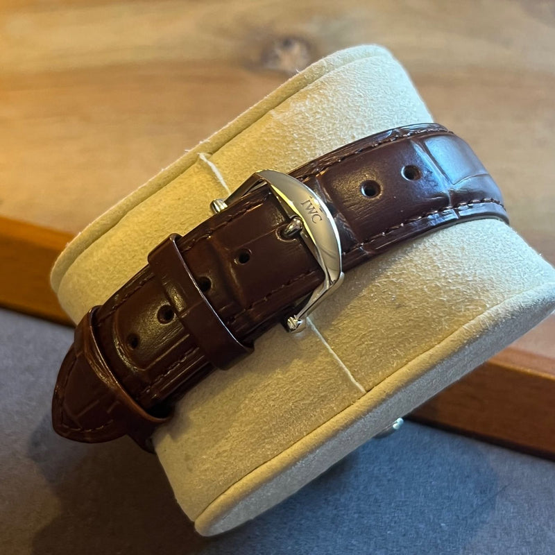 Diameter 42 mm. Thickness 13.6 mm. Between lugs 20 mm. Waterproof 30 meters. Stainless steel housing. Black dial. Domed sapphire crystal with anti-reflective treatment. Automatic movement caliber 75320. 44-hour power reserve. Number of jewels 25. Frequency 28,800 A/h. Original IWC steel pin buckle. Non-original replacement brown leather strap. Screwed solid caseback. Crown with IWC emblem.