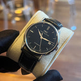 Diameter 39 mm. Thickness 9 mm. Between lugs 20 mm. Waterproof 30 meters. Stainless steel housing. Black dial without numbers. Baton indexes. Automatic movement caliber 35110. Power reserve of 42 hours. Number of jewels 25. Frequency 28,800 A/h. Sapphire crystal with anti-reflective treatment. Solid screwed steel case back. Crown with IWC emblem. Original IWC simple folding clasp. Black leather strap with white stitching, non-original replacement.