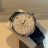 Functions: Hours, minutes, small seconds with stop device at 6 o'clock, power reserve display at 9 o'clock, date display at 3 o'clock.