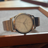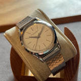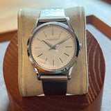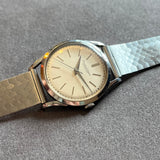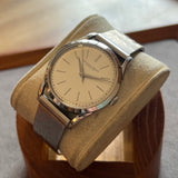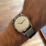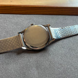 Diameter 36 mm. Wrist circumference 17 cm. Stainless steel case and bracelet. Smooth steel bezel. Silver dial without numbers. Sapphire crystal. Manual wind movement. Solid steel case back. Replacement bracelet non-original in stainless steel.Â